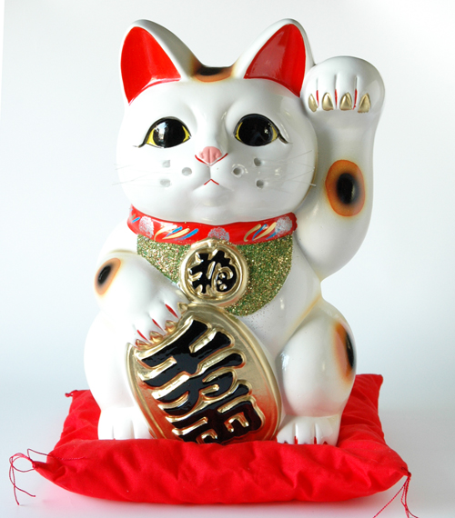 Intill syns en bild på en maneki-neko, den lyckobringande figuren som syns lite varstans i Japan. Det ser ut som att katten bara vinkar med tassen, men egentligen ”kallar” den på dig. Maneki-neko är en så kallad japanese bobtail, en kattras med kort, stumpaktig svans som tidigare bara fanns i Japan och enstaka delar av Asien. Även Hello Kitty är en bobtail, liksom tjuvkatten Muta i Studio Ghiblis ”Katternas Rike”. Pokémon-figuren Meowth hämtar också inspiration från maneki-neko, fast då med svans.