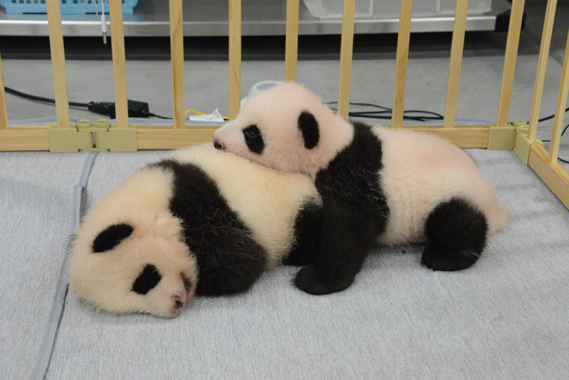 I mars tidigare i år kom uppgifter om att Ri Ri och Shin Shin parat sig för första gången sedan 2017. Det väckte hopp om att ett syskon till Shan Shan var på väg. I början på sommaren kom så de glada nyheterna att Shin Shin visade tecken på graviditet, och den 23 juni födde hon tvillingar (en pojke och en flicka). Pandaungar ser till början ut som rosa små råttor, men de växer fort. Redan efter en månad vägde tvillingarna ett kilo var – mer än nio gånger mer än vid födseln – och de har nu fått sin svartvita päls och sitt björnlika utseende.
