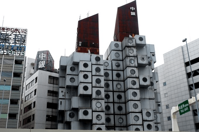 Nakagin Capsule Tower byggdes 1972 och huserar både bostäder och kontor. Det är 13 våningar stort och rymmer över 140 rum, 2,3 × 3,8 × 2,1 meter stora, och med ett runt fönster, 1.3 meter i diameter. Cirka 20 hyresgäster bodde i byggnaden fram till alldeles nyligen, men dessa har nu alltså flyttat ut.