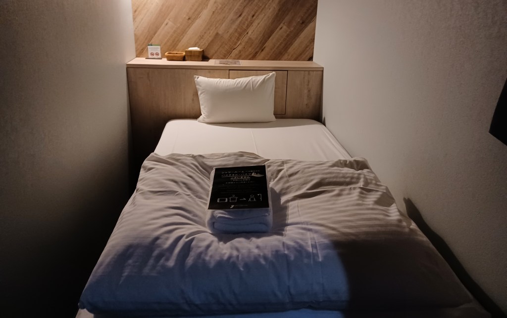 Såhär kan ett kapselrum se ut i modern tappning. Ett klassiskt kapselhotell (av den sort som först utvecklades i Japan mot slutet 70-talet) är ännu mindre, har sällan utrymme vid sidan av sängen samt lägre i tak, mer likt ett kylrum i ett bårhus. (Bilden är från Kanazawa, våren 2022.)