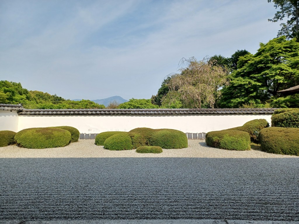 Utsiken från Shoden-ji är magnifik, med Hiei-berget strax till vänster och ett (förvisso överblommat) körsbärsträd till höger. Det är oklart om Bowie kunde höra ljudet av svingande golfklubbor från en golfbana cirka 500 meter därifrån. Templet uppfördes 1282, men golfbanan långt senare. Stenträdgården kallas Shishi-no-ko Watashi och är en så kallad ”karesansui”, med trädbuskar i ordningen 7-5-3, sett från höger. (Bilden är från våren 2022)