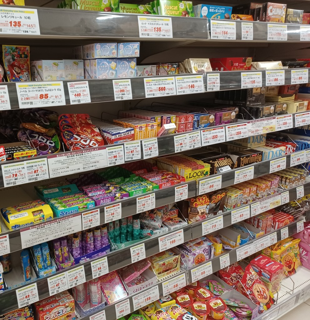 Snacks och godis är förhållandevis billigt i Japan, och det finns ingen sockerskatt att tala om. Dock säljs produkterna i relativt småskaliga förpackningar och det finns ingen tradition av självplock som i Sverige (förutom på enstaka biosalonger). Vän av saltlakrits och innovativt gelégodis skulle bli lätt besviken på Japan då huvuddelen av snacks och godis utgörs av chips och choklad. Framförallt finns inga blandpåsar och man får ofta nöja sig med en påse Haribo om man vill ha något som påminner om svenskt lösviktsgodis.
