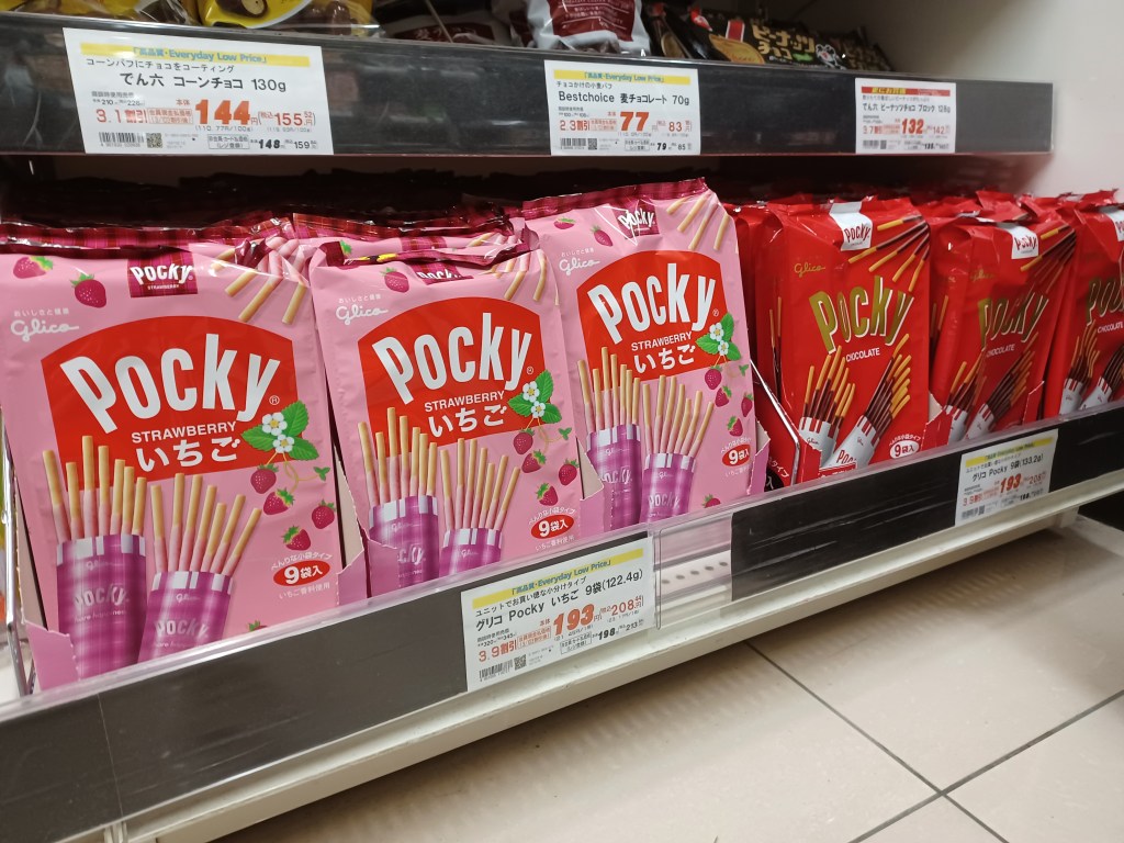 Glico är mest känd för sina Pocky, som förutom den röda originalversionen finns i en uppsjö av varianter. I vissa länder har Pocky sålts under namnet Mikado, vilket är ett annat namn på det klassiska sällskapsspelet Plockepinn. (Bilden är från lågpriskedjan OK Takadanobaba)