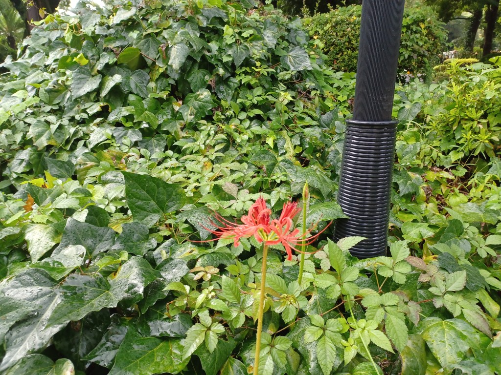 En ensam tempellilja sticker upp i regnet i Hibiya-parken, centrala Tokyo. En klassisk liknelse är att jämföra Higanbana med en blodfläck i gräset – dess dramatiskt röda färg på en till synes oskyldig terräng. Blomman blommar i mitten på september runt parker, tempel och trädgårdar. (Bilden är från igår)